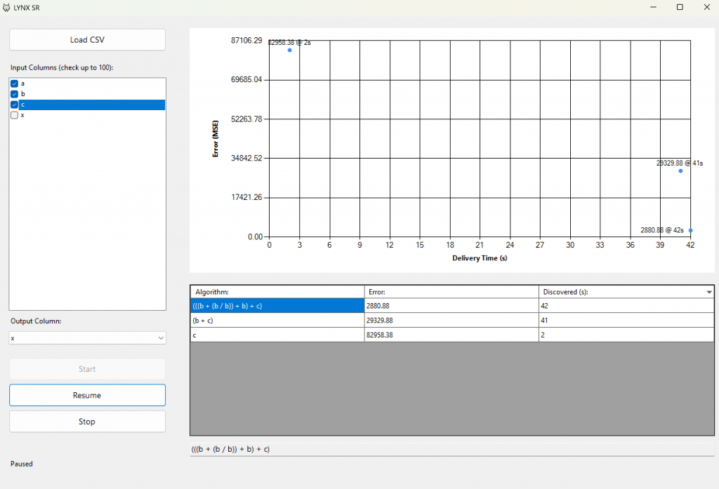 Using an evolutionary search strategy, LYNX explores millions of candidate equations to uncover relationships between your inputs and outputs. With each generation, the software converges toward simpler, more accurate, and more interpretable formulas that explain how your system truly works.